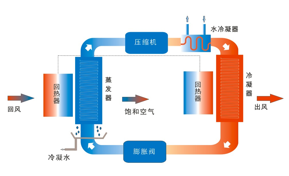 泳池除濕熱泵回?zé)嵫h(huán)是在除濕熱泵機(jī)內(nèi)增加回?zé)崞?,使進(jìn)入蒸發(fā)器的空氣溫度下降而進(jìn)去冷凝器的空氣溫度上升;回?zé)嵫h(huán)使蒸發(fā)器冷量用于空氣降溫減少(無(wú)效耗冷過(guò)程),而用于降溫除濕過(guò)程冷量增加,使熱泵干燥的最佳蒸發(fā)溫度及最佳除濕量上升;增加回?zé)嵫h(huán)的除濕熱泵是比普通泳池除濕熱泵是40%以上;