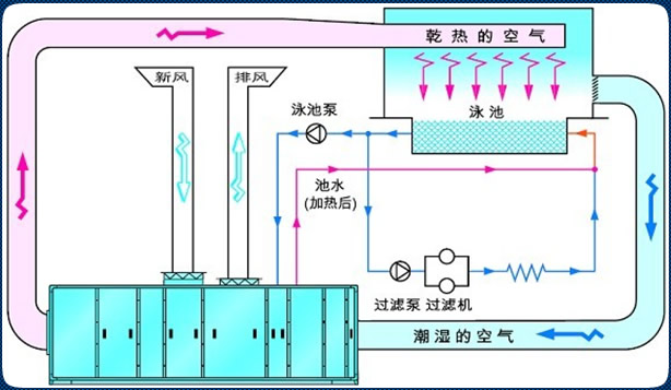 - 解決觀眾和泳池運(yùn)動(dòng)員對(duì)溫度要求不一致的難題;解決室內(nèi)潮濕含氯氣體對(duì)結(jié)構(gòu)腐蝕難題(空氣中的孢子能使控制質(zhì)量變壞,凝結(jié)后能使建筑物材料變質(zhì)) ,可延長(zhǎng)建筑物的適用壽命;解決室內(nèi)玻璃結(jié)露(對(duì)玻璃窗吹干燥空氣避免玻璃結(jié)露)和天棚滴水的難題;泳池恒溫恒濕熱泵既干燥了空氣達(dá)到除濕的效果,還可以回收蒸發(fā)掉的水份至泳池,減少泳池補(bǔ)充水;