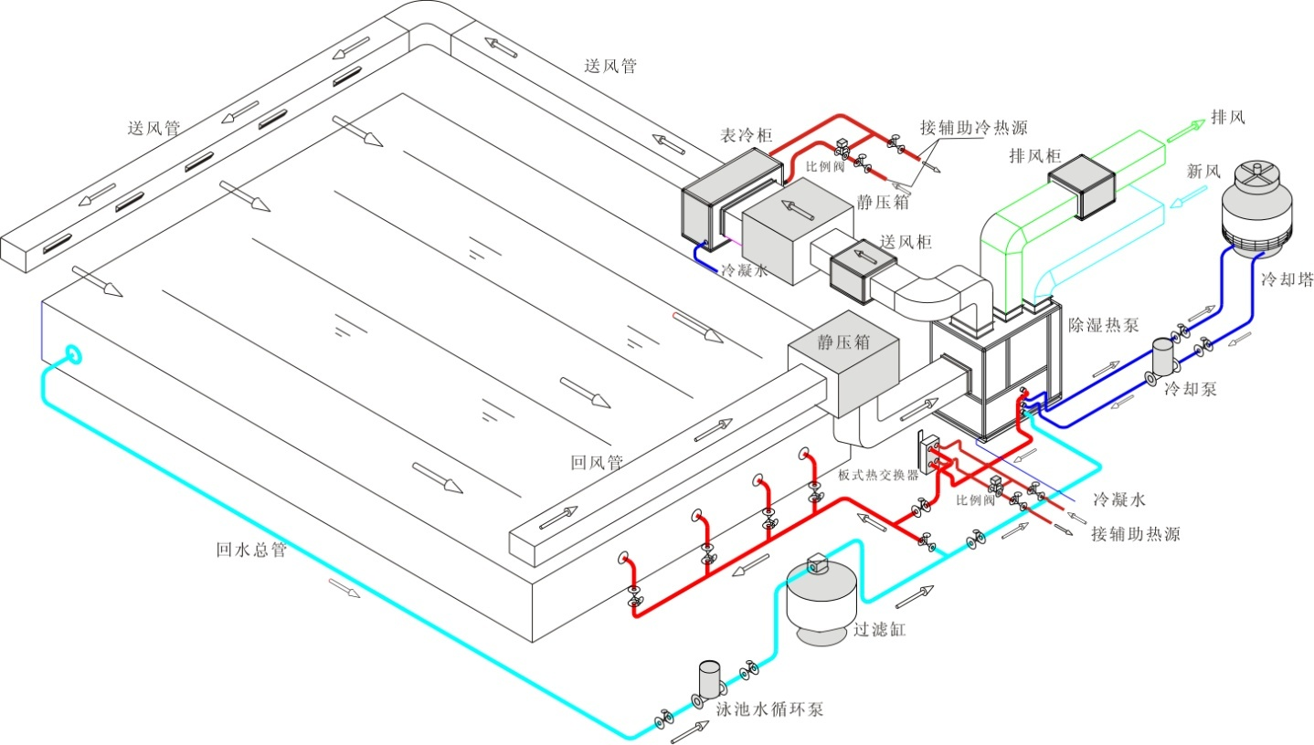 - 設(shè)置通風(fēng)換氣(新風(fēng))功能,充分保持室內(nèi)空氣質(zhì)量;機(jī)組設(shè)置能量回收裝置,可保持冬季排風(fēng)熱回收及夏季排風(fēng)的冷回收,充分節(jié)約運(yùn)行費(fèi)用;且通過(guò)新風(fēng)/排風(fēng)風(fēng)量,維持室內(nèi)負(fù)壓,防止泳池間空氣流失及影響周邊環(huán)境;